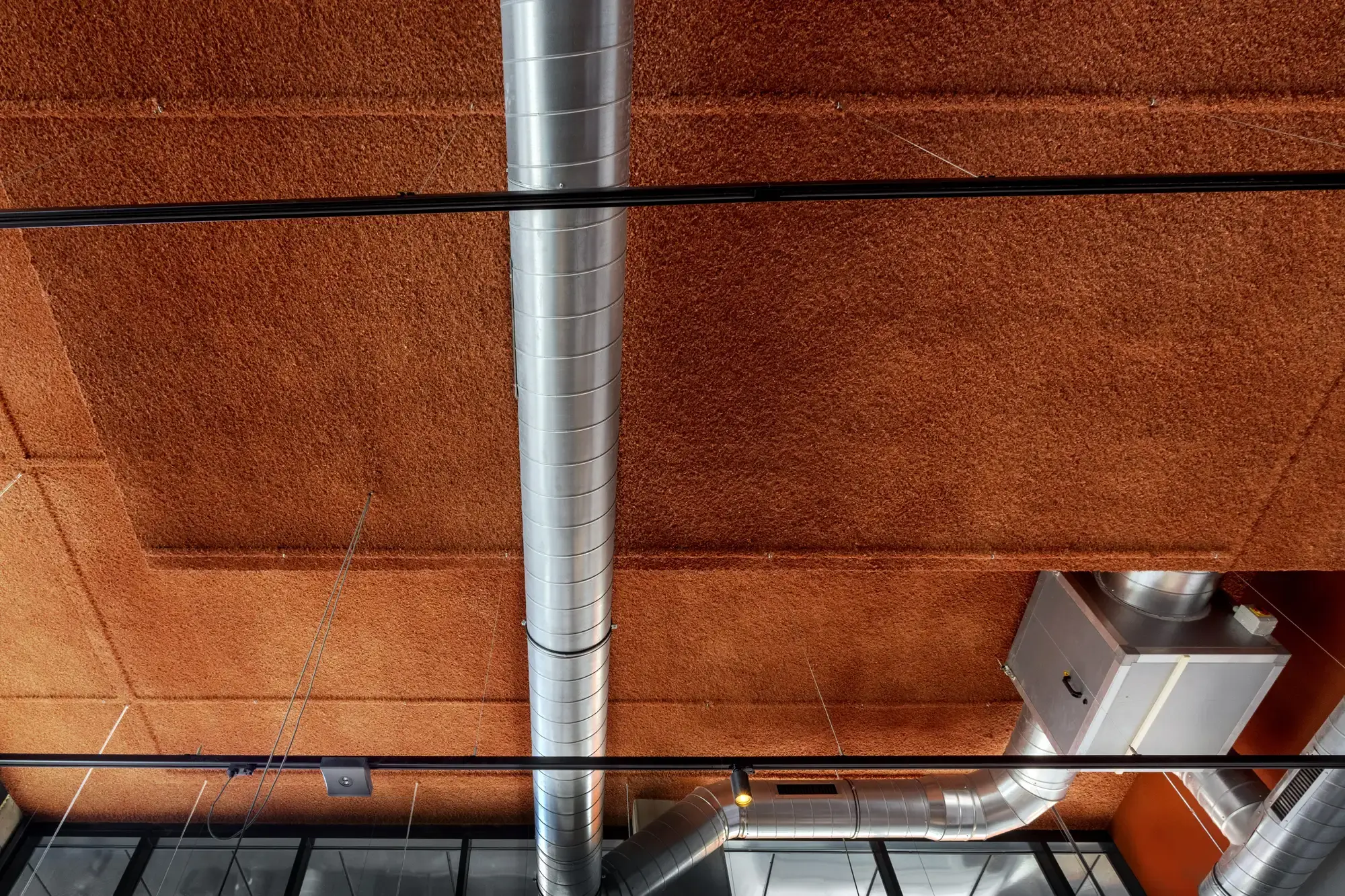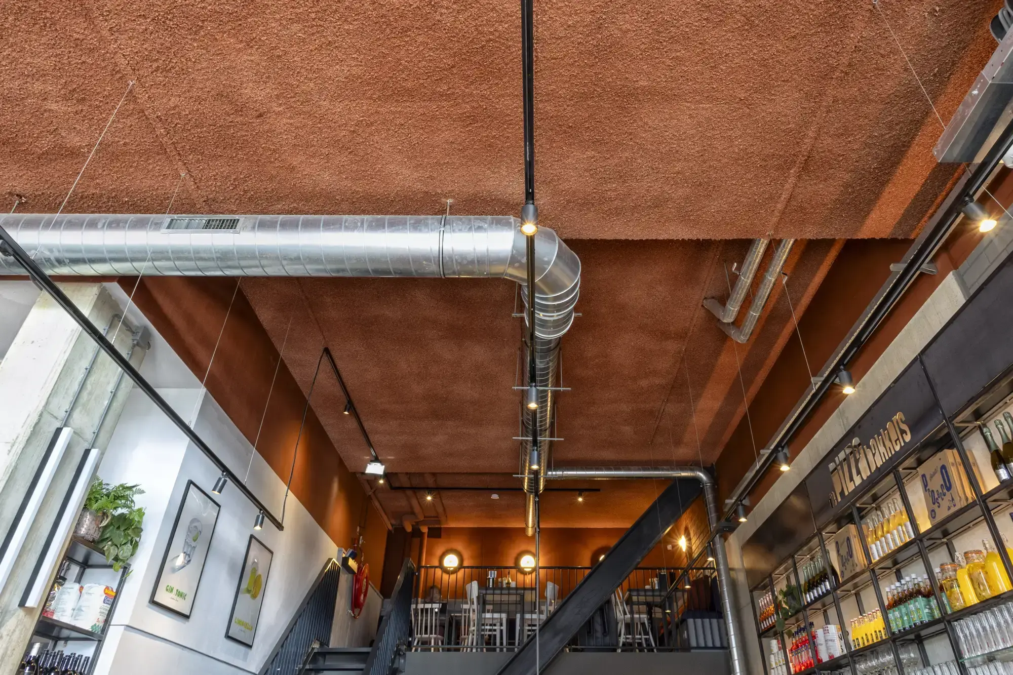 In het restaurant van De Pizzabakkers aan de NDSM-kade in Amsterdam hebben wij een prachtig akoestisch plafond mogen realiseren. Deze unieke kleur Terracotta hebben we speciaal voor De Pizzabakkers ontwikkeld, met dit als mooi eindresultaat.