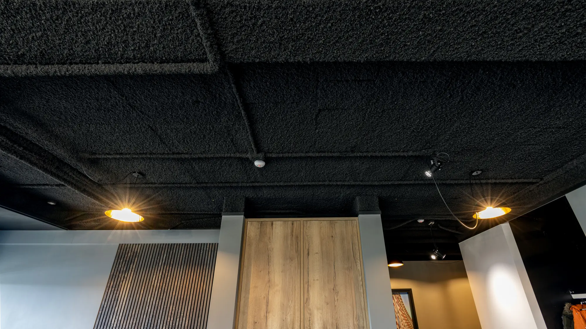 Het eindresultaat is prachtig geworden, met een warme uitstraling! Er werd gekozen voor de kleur Acomo®Solid Zwart van ACOMO® Acoustic Spray System.
